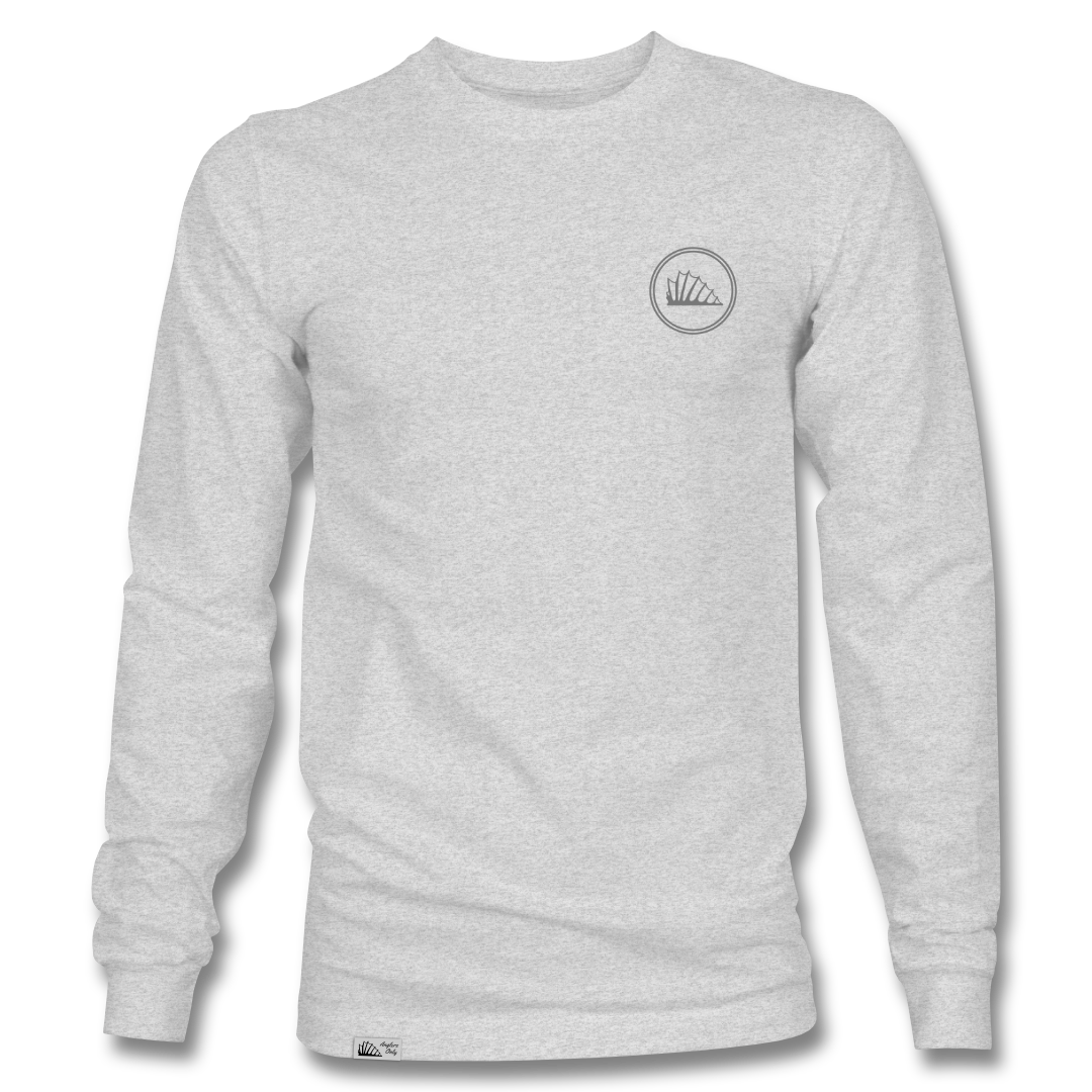 Long-sleeve tee in ash grey, with a dark grey print sitting on the left chest, and finished with the Anglers Only hem tag.