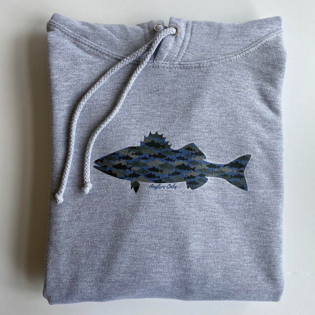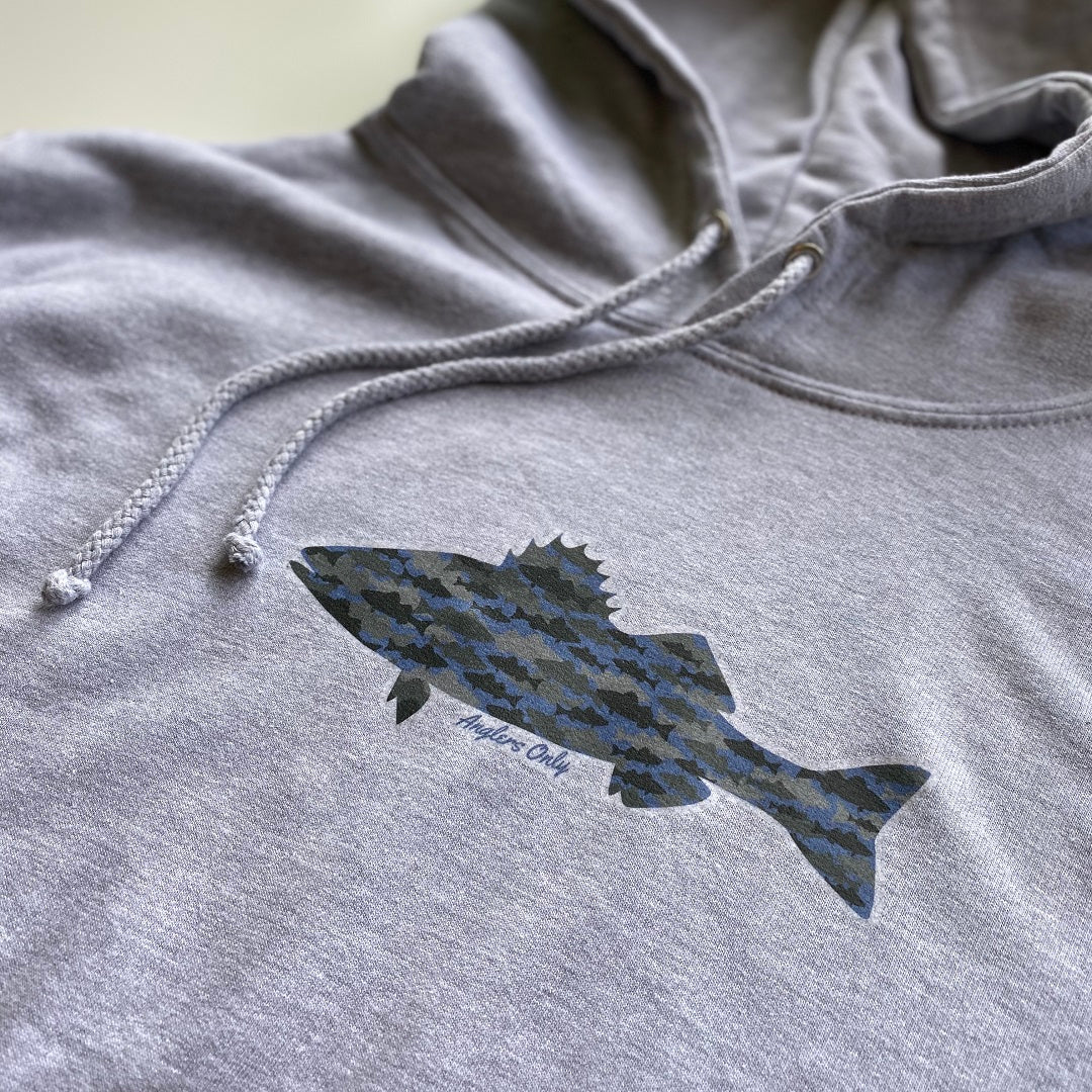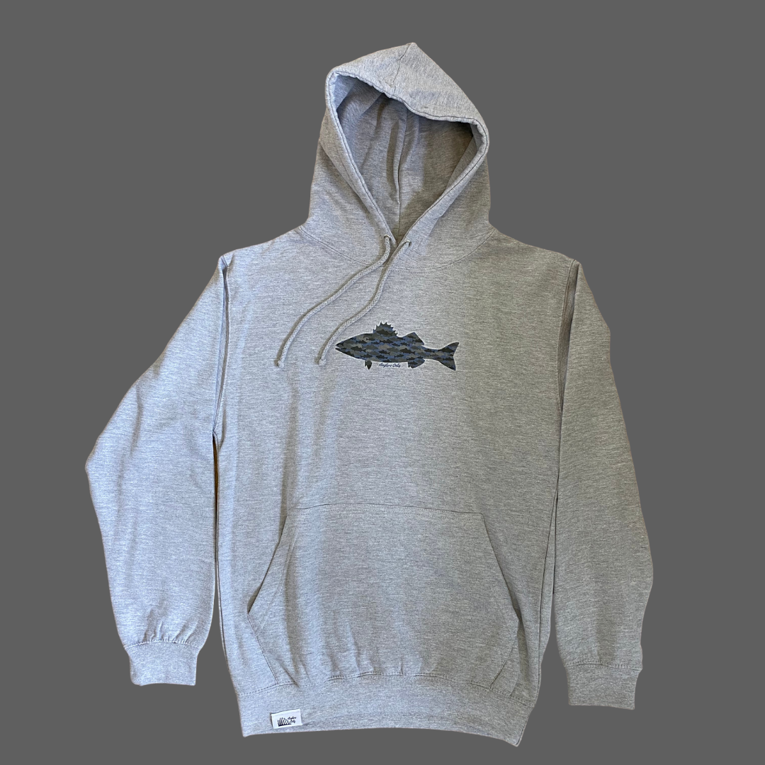 Classic hoodie in heather grey, with the bass print sitting front and centre, and finished with the Anglers Only hem tag.