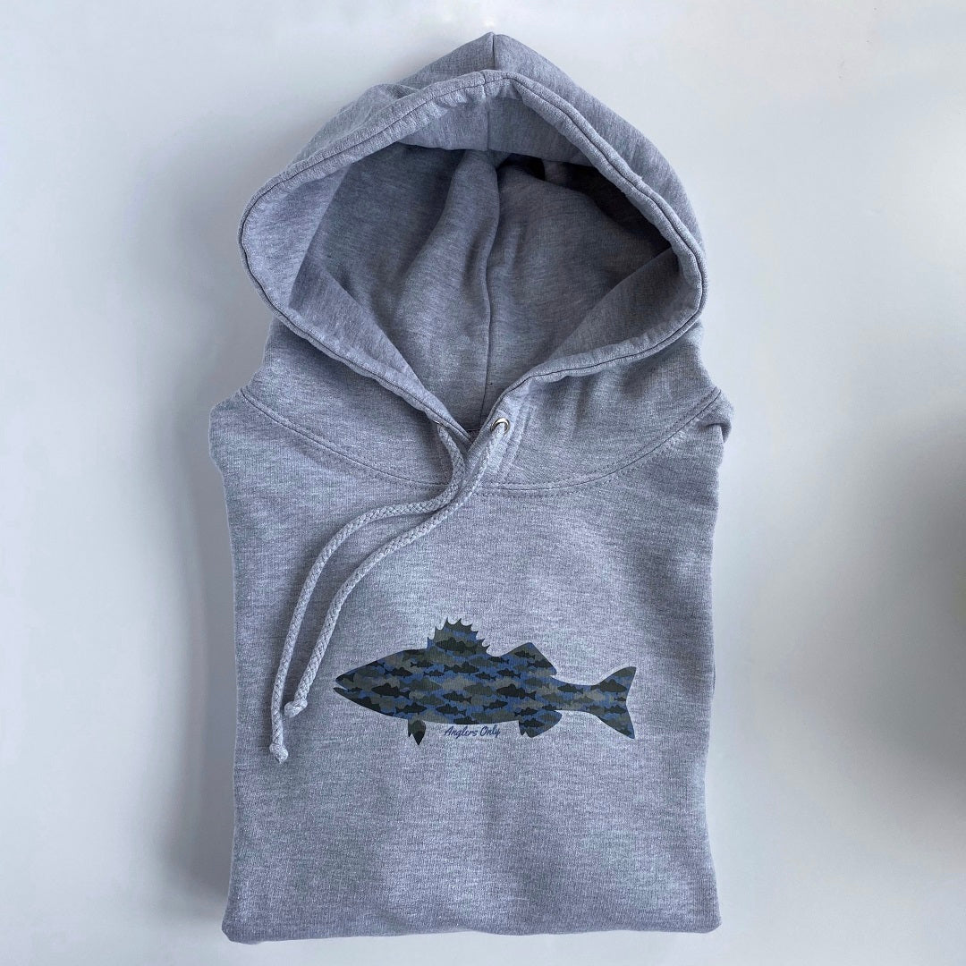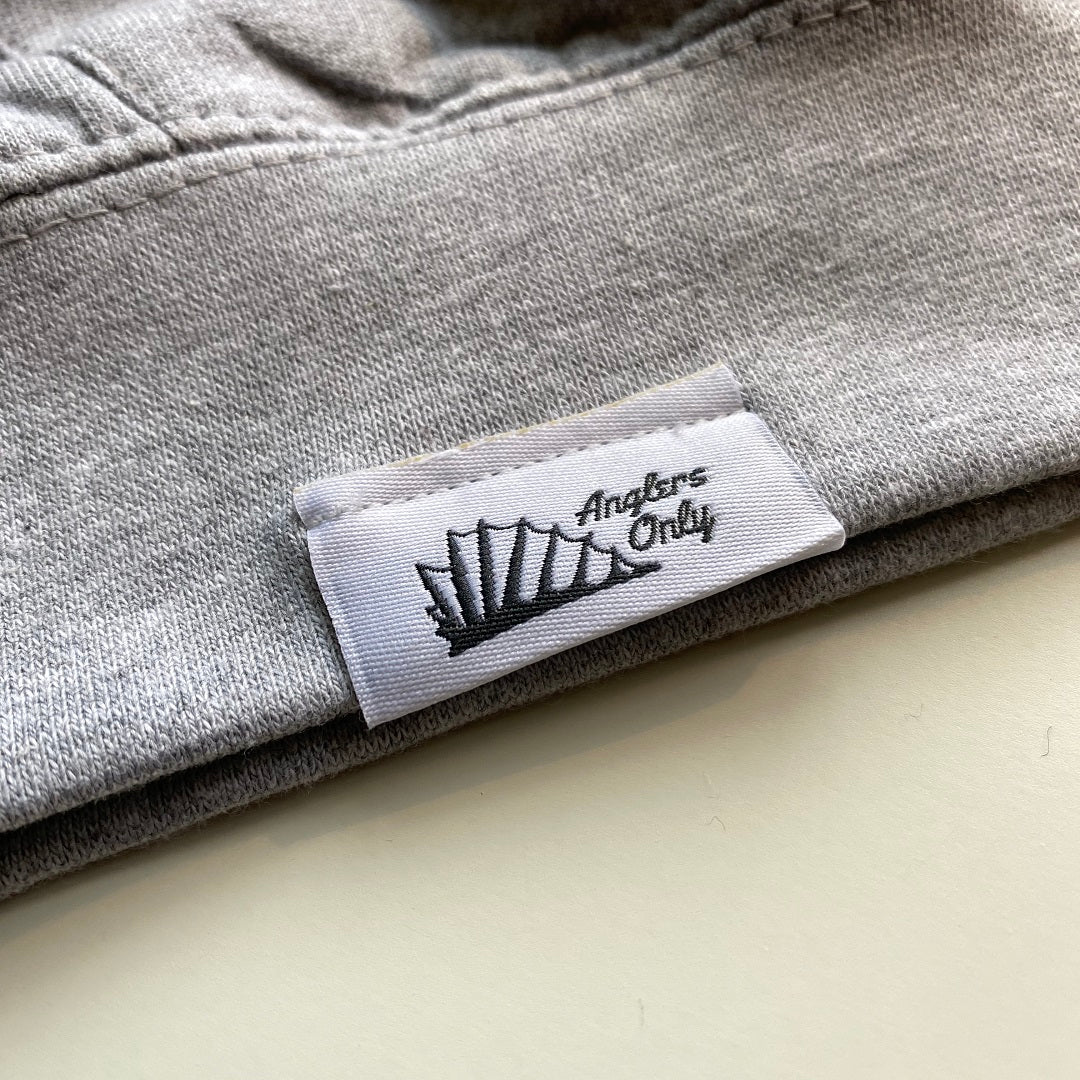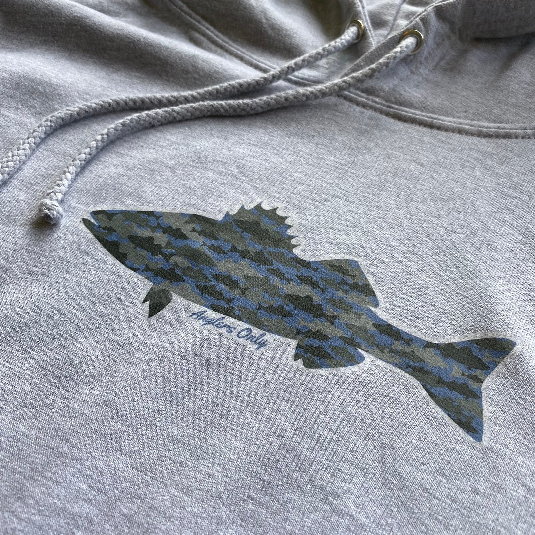 Classic hoodie in heather grey, with the bass print sitting front and centre, and finished with the Anglers Only hem tag.